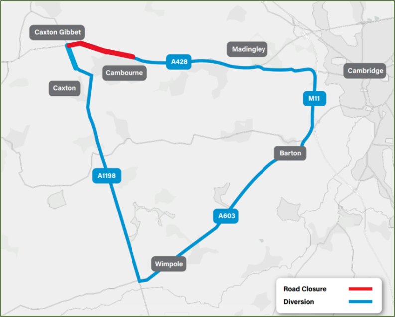 We'll close the A428 in both directions between Caxton Gibbet and Cambourne overnight (8pm - 6am) from Tuesday 2 to Wednesday 3 December 2025