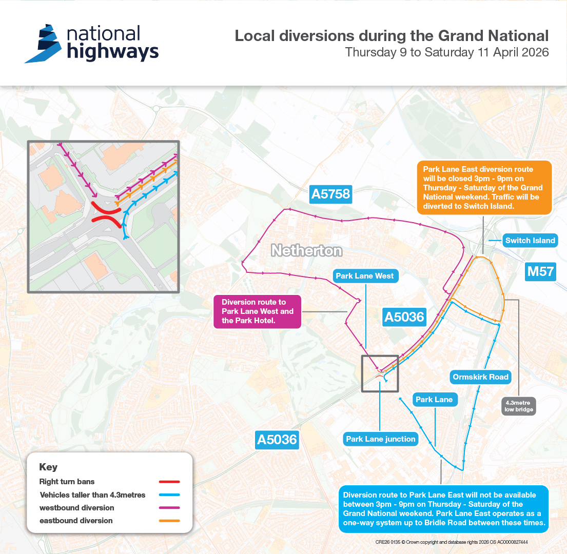The only change from a usual Grand National week is the temporary ban on right turns from the A5036 onto Park Lane West.