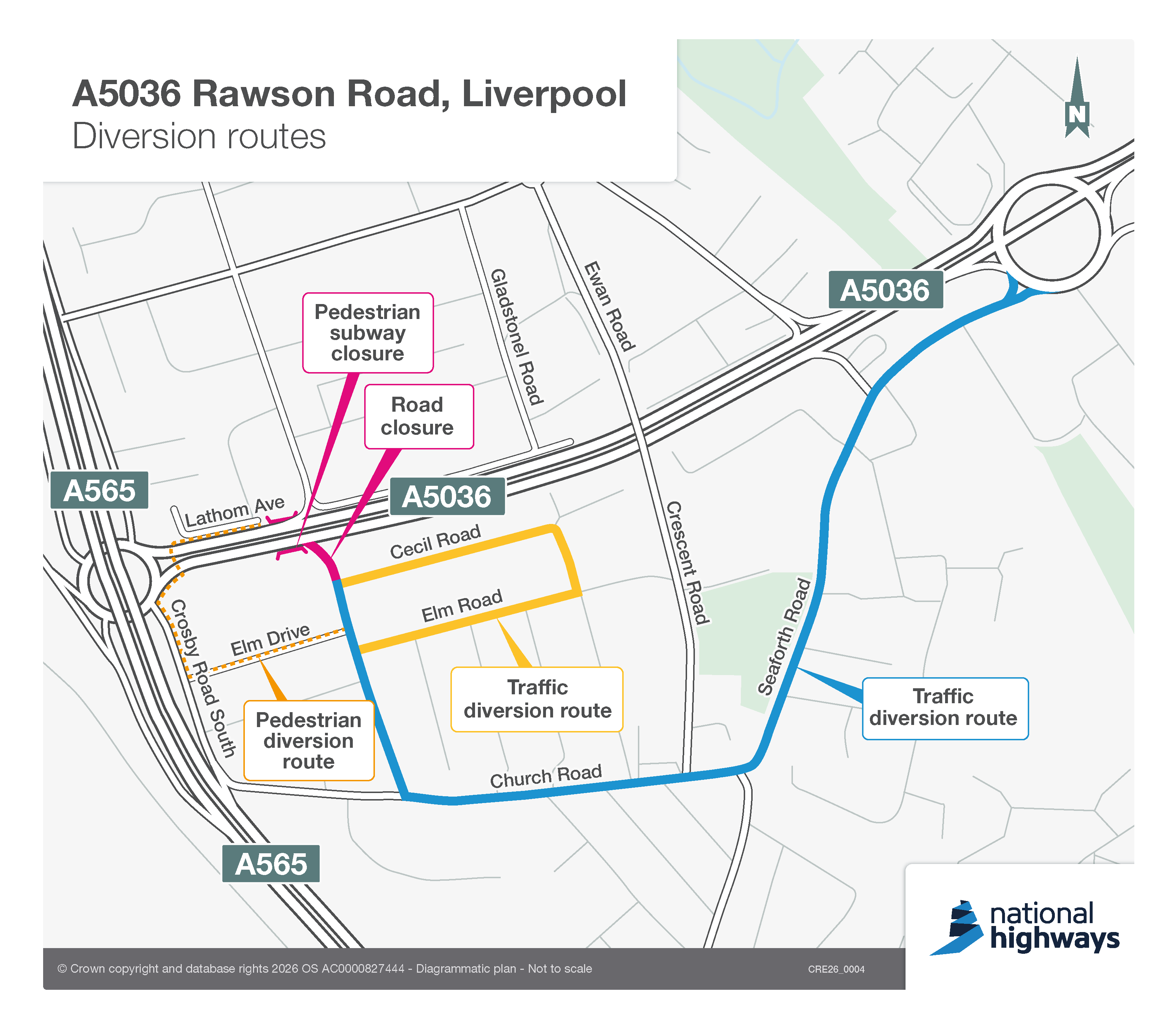 - along Elm Drive onto Crosby Road South where temporary pedestrian traffic lights will be at Princess Way (dual carriageway)