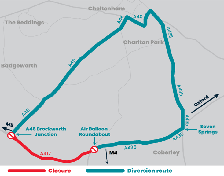 A417 Air Balloon roundabout to Brockworth junction diversion map