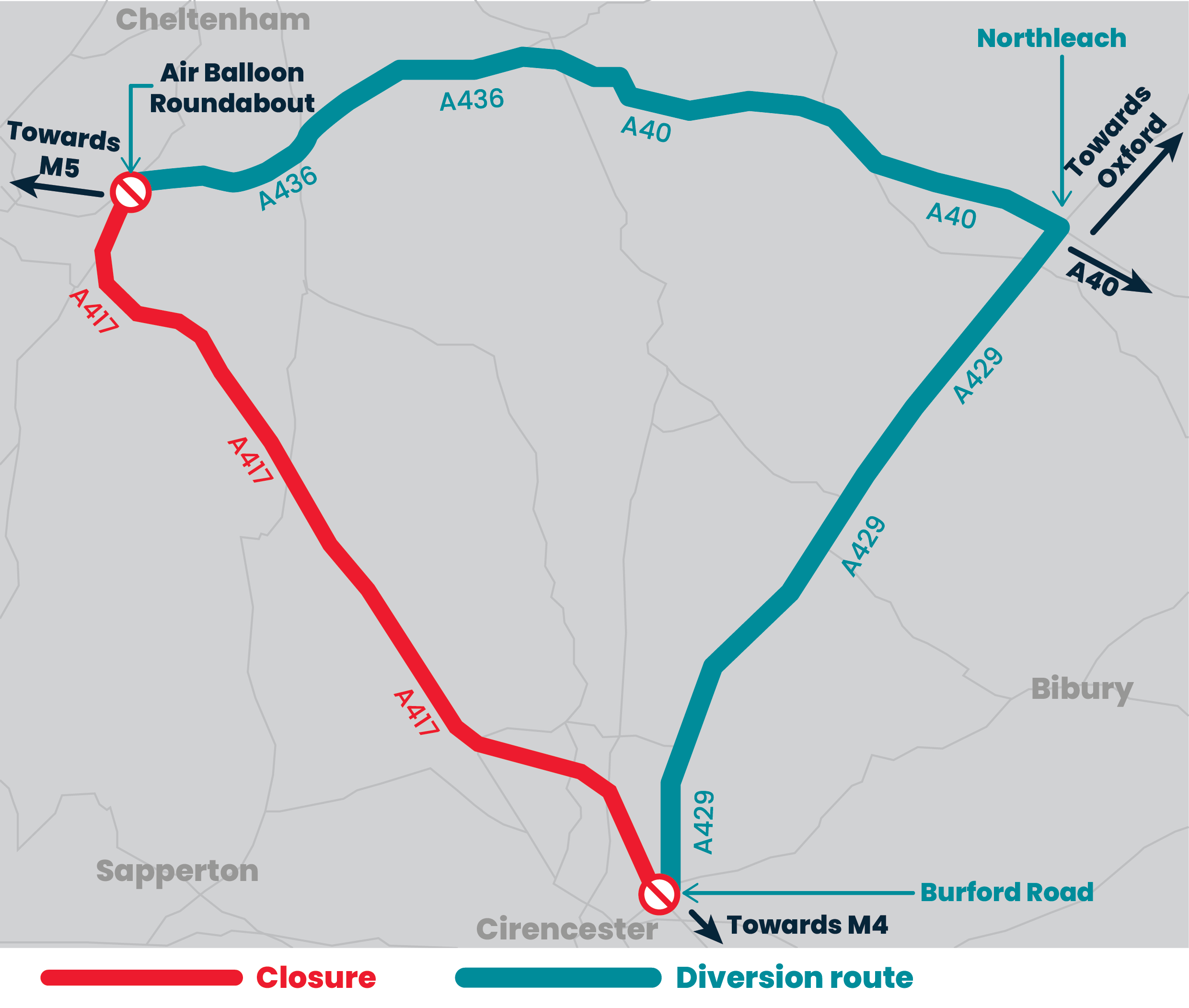 - The A417 will be closed in both directions between the A429 Burford Road to the Air Balloon roundabout