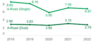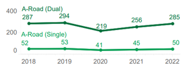Single carriageway A-roads present challenges, with characteristics that can increase exposure to risk. Dual carriageway A-roads carry more traffic and, although they have a lower KSI rate per vehicle mile, their high usage contributes to a greater total number of KSIs.