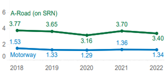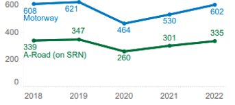KSIs per hmvm on Motorways and A-Roads: 2018-2022