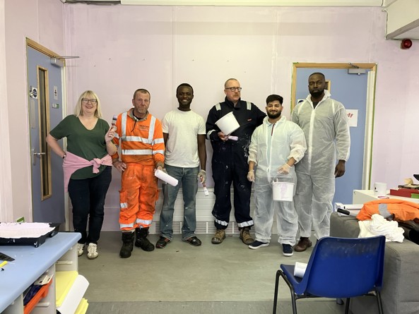 Volunteers from National Highways’ A52 Priory to QMC improvements scheme grabbed their paint brushes and overalls to help redecorate the Heathfield Community Centre which is the home of The Pythian Club.