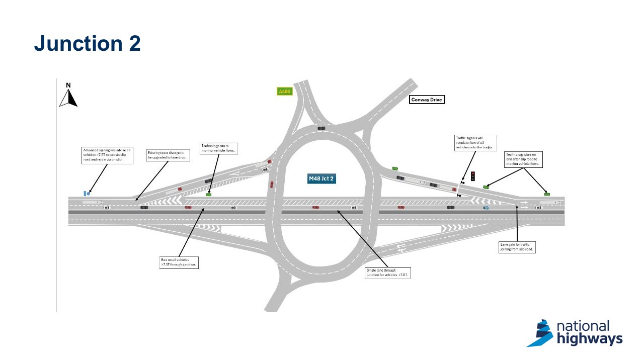 To solve this, from next autumn HGVs will leave the M48 at Junctions 1 (westbound) and Junction 2 (eastbound) via the off-slip roads with re-entry controlled by signals on the on-slips.