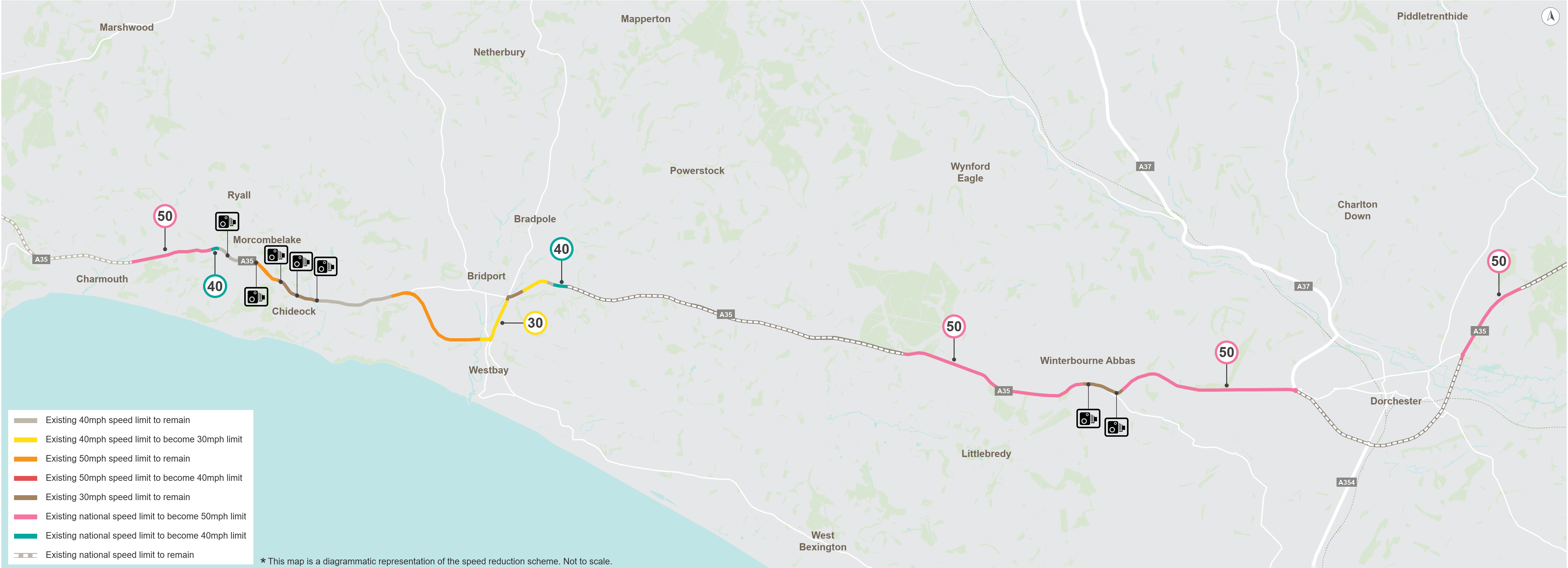 The average speed cameras will be installed in the villages of Winterbourne Abbas, Morcombelake and Chideock to enforce the existing speed limits, while changed and enforceable speed restrictions will be introduced as follows: