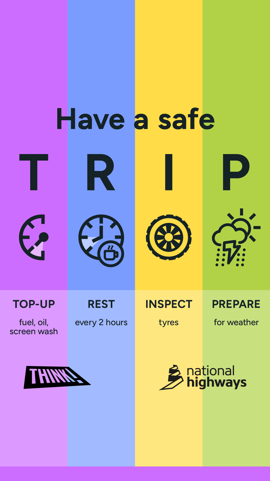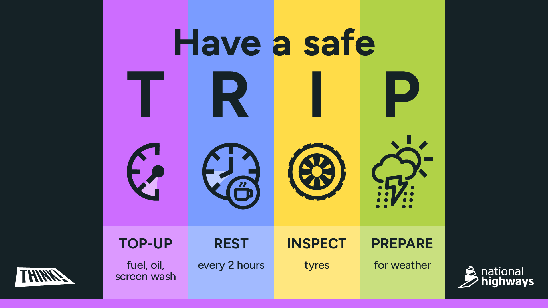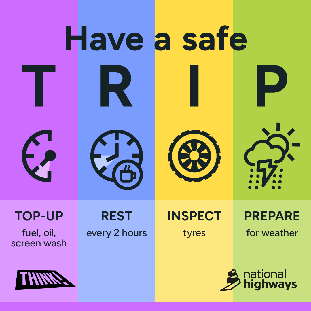 To support this vision and help road users to stay – and feel – safer on our roads, our long-term T.R.I.P. campaign encourages drivers to prepare for long or significant journeys.